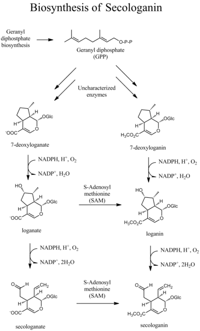 - «Secologanin Biosynthesis». Archivado desde el original el 9 de mayo de 2017. Consultado el 31 de mayo de 2011.