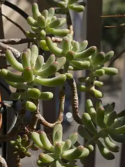 La planta conocida como dedos de Dios (Sedum pachyphyllum)[1] es una planta perteneciente a la familia de crasuláceas. Su origen es desconocido solo se ha estudiado con material proveniente de cultivos. Se ha atribuido su origen a las Montañas de Oaxaca, México, entre los 1800 y 2100 metros sobre el nivel del mar. A pesar de su origen desconocido, es ampliamente cultivada y existen numerosas variedades e híbridos empleados con fines ornamentales.[2][3] Es un pequeño arbusto perenne de hojas suculentas en forma de dedos pequeños. Crece hasta 30 cm de altura. Se propaga fácilmente a través de sus hojas. Sus flores son estrelladas y amarillas.[4]