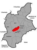Limita con las parroquias de Eiré y Ferreira al norte, Deade al este, San Pedro Félix de Cangas y Pombeiro al sur y Atán al oeste.