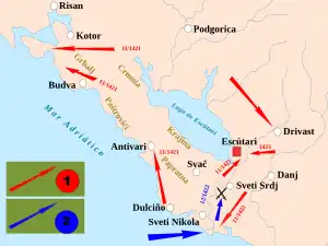 Las fuerzas de Lazarevic sitiaron Escútari, probablemente en junio de 1422, y durante un año, parecía que Venecia había perdido sus posesiones. En noviembre de 1422 la flota veneciana destruyó las fortalezas de Mazarek junto al Bojana y alcanzó Sveti Srđ, pero el bajo nivel del río les impidió seguir remontándolo.[7]