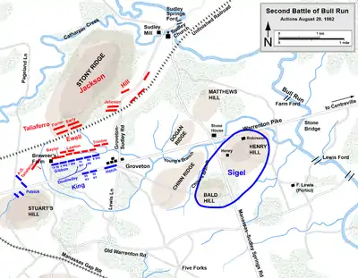 La intención de Pope era avanzar sobre los dos flancos de Jackson. Ordenó a Fitz John Porter avanzar hacia Gainesville y atacar lo que pensaba que era el flanco derecho confederado. Ordenó a Sigel atacar el ala izquierda de Jackson al amanecer. Sigel, desconociendo la situación de las tropas de Jackson, eligió avanzar con un frente amplio, con la división del general de brigada Robert C. Schenck, apoyada por la división del general de brigada John F. Reynolds (del III Cuerpo de Heintzelman) en la izquierda, la brigada independiente del general de brigada Robert H. Milroy en el centro, y la división del general de brigada Carl Schurz en la derecha. Las dos brigadas de Schurz, avanzando hacia el norte por el camino Manassas-Sudley, fueron las primeras en contactar con los hombres de Jackson hacia las 7 de la mañana.[16]