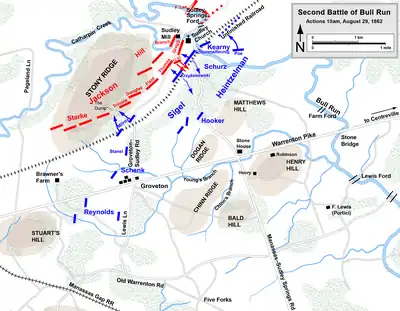 Poco después del mediodía, Pope ordenó a los cuerpos de Porter, apoyados por Hatch y Reynolds, que avanzaran hacia el oeste a lo largo de la carretera. En ese momento, Ricketts, Kearny y Hooker avanzarían también por la derecha de la línea de la Unión. Este doble movimiento podría destrozar a los confederados en retirada. Pero el problema era que no solo los confederados no se estaban retirando, sino que estaban esperando el ataque de la Unión. Lee estaba aún esperando una oportunidad propicia para contraatacar con la fuerza de Longstreet. Aunque no estaba seguro de que Pope atacara ese día, Lee colocó 18 piezas de artillería bajo el mando del coronel Stephen D. Lee en lo alto de la elevación que había al noreste de Brawner Farm, cubriendo así todo el campo abierto que había justo enfrente de las tropas de Jackson.[30]