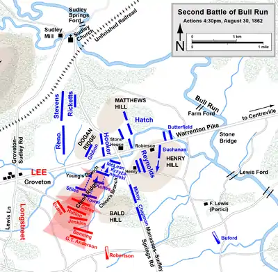 En el flanco derecho confederado, Longstreet observó un movimiento de la fuerza de McDowell alejándose de él: el I Cuerpo estaba moviendo sus divisiones hacia Henry House Hill para apoyar a Reynolds. Esta noticia hizo que Lee recuperara su plan de avanzar en dicho sector. Longstreet de nuevo se opuso, argumentando esta vez lo inadecuado de atacar antes del anochecer. Sugirió en su lugar realizar un reconocimiento de las líneas federales para poder así situar en la mejor posición a las tropas confederadas en la mañana del día siguiente antes del inicio del ataque. Lee estuvo de acuerdo y la división de Hood fue enviada hacia adelante. En ese momento, Pope, que seguía creyendo que los confederados se estaban retirando, envió a la división de John P. Hatch al oeste para perseguir a los confederados por la carretera de Warrenton. Las tropas de Hood y Hatch chocaron brevemente en el cruce de Groventon de forma violenta, retirándose ambas al anochecer, si bien por un momento Lee volvió a tener la idea de realizar un asalto, siendo de nuevo Longstreet quien le disuadió.[26]
