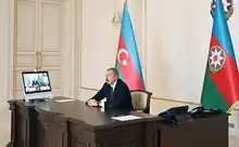 El acuerdo de paz y el fin de la guerra fueron vistos como una victoria y ampliamente celebrados en Azerbaiyán.[201][202] El 10 de noviembre de 2020, multitudes ondearon banderas en Bakú después de que se anunciara el acuerdo de paz.[203] Ese día, el presidente de Azerbaiyán, Ilham Aliyev, pronunció un discurso en el que burlonamente dijo: Nə oldu Paşinyan? ("¿Qué pasó Pashinyan?"), que se convirtió en un meme de Internet en Azerbaiyán y Turquía.[204][205] El 11 de noviembre, en una reunión con militares azerbaiyanos heridos que participaron en la guerra, Aliyev dijo que se establecerían nuevas órdenes y medallas en Azerbaiyán y que dio instrucciones apropiadas para premiar a civiles y militares que demostraran "heroísmo en el campo de batalla y en la retaguardia y se distinguieron en esta guerra". También propuso los nombres de estas órdenes y medallas.[206] Aproximadamente una semana después, en una sesión plenaria de la Asamblea Nacional de Azerbaiyán, se presentó para discusión un proyecto de ley sobre enmiendas a la ley "Sobre el establecimiento de órdenes y medallas de la República de Azerbaiyán".[207] El mismo día en primera lectura se establecieron diecisiete nuevas órdenes y medallas de conformidad con el proyecto de ley "Sobre el establecimiento de órdenes y medallas de la República de Azerbaiyán".[208] A mediados de noviembre, Aliyev y la Primer vicepresidente de Azerbaiyán, Mehriban Aliyeva, visitaron los distritos de Fuzuli y Jabrayil, ambos pueblos fantasmas en ruinas después de que las fuerzas armenias los ocuparan en 1993.[209] Aliyev ordenó a la Agencia Estatal de Carreteras de Automóviles de Azerbaiyán para construir una nueva autopista, a partir de Alxanlı, que conectará Fuzuli con Shusha.[210] En Jabrayil, Aliyev afirmó que se elaborará un "nuevo plan maestro" para reconstruir la ciudad.[211]