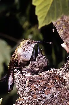 ![]() Hembra de (Selasphorus platycercus) en nido | ||
