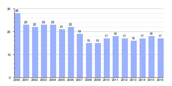 | Gráfica de evolución demográfica de Selga de Ordás[2] entre 2000 y 2016 |