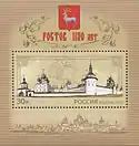 ![]() | 20.08 | 1) Vista del Kremlin de Rostov de Rostov sobre un mapa histórico de la de la ciudad En la hoja bloque se reproduce un fragmento del grabado Vista de Rostov el Viejo desde el lado sur del artista Iván Belonogov, así como en el escudo de Rostov | 65,0 × 32,5 (80 × 85) | 30,00 |