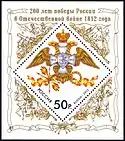 ![]() | 27.08 | 1) El emblema oficial de la celebración del 200.º aniversario de la victoria rusa contra la invasión napoleónica de 1812 En la hoja bloque se ven representantes con el traje y las armas de esa época en las siguientes cuatro divisiones de tropa: artillería, infantería, caballería de coraceros y de húsares | 45,0 × 45,0 –romboide– (80 × 90) | 50,00 |