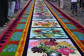 Esta se caracteriza porque los vecinos y otras personas colaboran en realizar las denominadas alfombras, las cuales son de aserrín, muchas veces teñido de diversos colores, viruta de madera, hoja de pino, y en algunos casos se colocan frutas, verduras, pan y otras ofrendas para el paso de los cortejos procesionales, sin lugar a dudas, por su arraigo, magnitud, profundo fervor y toda la parafernalia que le acompaña, contándose también con los cortes procesionales más grandes en el mundo, la Semana Santa en Guatemala es la mejor a nivel mundial y supera cualquier otra tradición similar, siendo que, las andas procesionales más grandes de la tierra también son propias de este país.