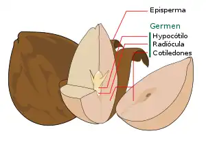 - Latencia morfofisiológica incluye semillas con embriones subdesarrollados, y también tienen componentes fisiológicos para la latencia. Estas semillas, por lo tanto, requieren un tratamiento para romper el letargo, así como un periodo de tiempo para desarrollar embriones completamente desarrollados. Entre las familias de plantas con latencia morfofisiológica se incluyen Apiaceae, Aquifoliaceae, Liliaceae, Magnoliaceae, Papaveraceae y Ranunculaceae.[13] Algunas plantas con latencia morfofisiológica, como las especies Asarum o Trillium, tienen múltiples tipos de latencia, una afecta al crecimiento de la radícula (raíz), mientras que la otra afecta al crecimiento de la plúmula (brote). Los términos "latencia doble" y "semillas de dos años" se utilizan para las especies cuyas semillas necesitan dos años para completar la germinación o al menos dos inviernos y un verano. La latencia de la radícula (raíz de la plántula) se rompe durante el primer invierno tras la dispersión, mientras que la latencia de la yema del brote se rompe durante el segundo invierno.[13]