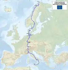 Los inicios de camino en Grövelsjön (Lago Grövel), el cual recorre la frontera sueca-noruega cerca de Idre. Utiliza una serie de establecidos caminos en Varberg, una ciudad en el sur de Göteborg, de donde un ferry navega hasta Dinamarca.