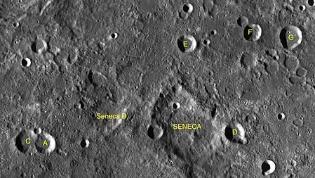 Por convención estos elementos son identificados en los mapas lunares poniendo la letra en el lado del punto medio del cráter que está más cercano a Seneca.