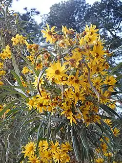Es un arbusto muy frondoso y ramificado desde la base, de 1 a 3 metros de alto, alcanzando algunos ejemplares los 4.5 metros. Los tallos son medulosos y quebradizos, con tomento blanco de densidad variable. Las hojas son sésiles, angostamente lanceoladas u oblongo-lanceoladas, de unos 15 cm de largo y hasta 2 de ancho; ápice agudo o acuminado, borde entero o denticulado, con el haz glabro a tomentuloso y el envés con un denso tomento blanco. La inflorescencia en forma de panícula contiene numerosas cabezuelas radiadas y pediceladas, de involucro campanulado o subcilíndrico. El capítulo está conformado por alrededor de una docena de flores liguladas y medio centenar de flores del disco, todas amarillas. El fruto es una cipsela claviforme o subcilíndrica de 2 mm de largo, de color marrón o verdoso, provista con un vilano de cerdas blancas.[1]