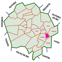 - «Decreto 17/1999, de 21 de enero, por el que se determinan los nombres oficiales de las parroquias pertenecientes a los ayuntamientos de Vedra (A Coruña) y Begonte, Carballedo, Chantada, O Corgo, Folgoso do Courel, Friol, Guntín, Láncara, Outeiro de Rei, Pedrafita do Cebreiro y Ribas de Sil (Lugo).». Diario Oficial de Galicia n.º 25. España. 8 de febrero de 1999. p. 1347. Consultado el 2 de enero de 2021.