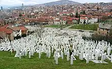 Los objetos religiosos también fueron dañados o destruidos. De las 498 mezquitas en Kosovo que estaban en uso activo, el Tribunal Penal Internacional para la ex Yugoslavia (TPIY) documentó que 225 mezquitas sufrieron daños o destrucción por parte del ejército serbio yugoslavo.[45] En total, dieciocho meses de la campaña de contrainsurgencia serbia yugoslava entre 1998-1999 en Kosovo resultaron en 225 o un tercio de un total de 600 mezquitas dañadas, destrozadas o destruidas.[46][47] Durante la guerra, el patrimonio arquitectónico islámico posó para las fuerzas militares y paramilitares serbias yugoslavas como patrimonio albanés con la destrucción del patrimonio arquitectónico no serbio como un componente metódico y planificado de la limpieza étnica en Kosovo[47][48]