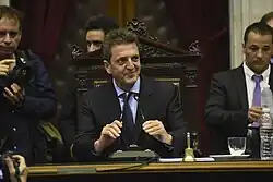 Sergio Tomás Massa ( (ⓘ); San Martín, 28 de abril de 1972) es un abogado y político argentino, miembro de Unión por la Patria, anteriormente denominada Frente de Todos, coalición política de tendencia peronista y progresista.[5]