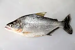 El cuerpo es muy alargado con la cabeza moderada y muy aguzada, plateada con el iris amarillo. El cuerpo es romboidal, de color plateado verdoso metálico en juveniles, sin manchas o marcas distintivas a excepto de una mancha negra en la base de la aleta caudal. Las aletas son incoloras o transparentes. En los adultos el cuerpo es generalmente plateado-plomizo hacia la región dorsal. Las regiones pectorales y abdominal son anaranjada a rojo fuego. Una mancha negra en la región humeral por encima de la aleta pectoral. Cabeza similar al cuerpo con la región dorsal gris y la ventral amarilla a rojo. Iris amarillo a rojo, variable. Caudal en adultos muy oscura. Ejemplares en alcohol muestran series de puntos o bandas transversales en el cuerpo sobre todo en la región dorsolateral.[1]