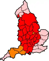 Shires tradicionales de Inglaterra (en rojo).