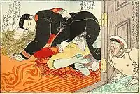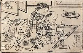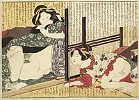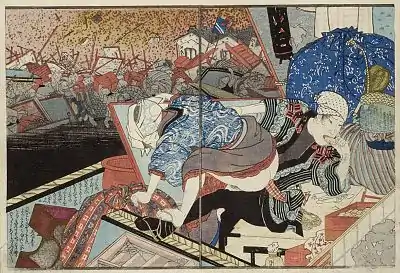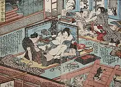Ilustración del libro de 1835 Hana goyomi (華古与見?) por Utagawa Kuniyoshi. En esta imagen el texto que se encuentra en la parte inferior izquierda dice lo siguiente:[71] 「コウお花さん、おらアおめへがひもじかろうと思つて、店から来た弁当を持つて来たぜ」 「そうかへ、実があるねへ、わちきやアそれよりか早く、なんしたいよ」 「フン、なんするたアこうやるのか」トうしろからづぶ/\。 -Ten, Ohana-san. Como pensé que estarías hambrienta, te he traído de la tienda algo de comer. -¡Ah, eres muy considerado, pero prefiero que lo hagamos primero! -Está bien, entonces lo haremos así... – y mientras la abordaba desde atrás, se oía: gup, gup, gup. |