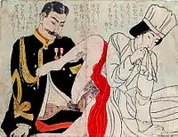 Durante los primeros años del nuevo gobierno Meiji el país adoptó la moralidad victoriana,[8][41] y se estableció una prohibición explícita en el shunga (shunga no kinshi)[42] y «el obsceno nishiki-e» en la prefectura de Tokio en 1869. Sin embargo, el shunga continuó produciéndose, asimilando algunos de los cambios estéticos de la época, que estuvieron marcados por los procesos de importación de patrones y técnicas occidentales. A nivel temático y de personajes representados, también se observa la incorporación de nuevos elementos representativos de la nueva sociedad. A partir de este momento, por ejemplo, son frecuentes las escenas de hombres uniformados al estilo occidental y con barba manteniendo relaciones con enfermeras. Yoshida Teruji asegura que durante este período el consumo de estampas baratas aumentó, pues se las consideraba una especie de amuletos para la buena suerte, especialmente entre las geishas.[20]