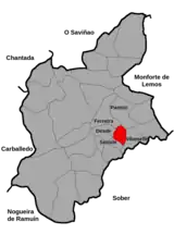 Limita con las parroquias de Ferreira y Pantón al norte, Vilamelle al este, Serode al sur, y Deade al oeste.