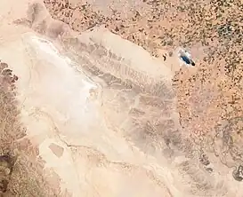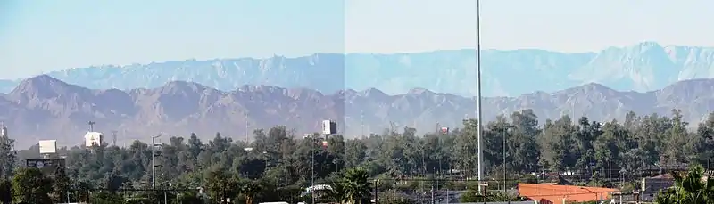 ![]() Al centro, oblicuamente, la sierra Cucapá vista desde la estación espacial internacional. A la izquierda y abajo, puede apreciarse el contorno de la laguna Salada; al centro arriba parte de la mancha urbana de la ciudad de Mexicali y desde arriba y a la derecha una porción del área agrícola del valle de Mexicali. | ||