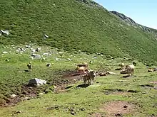 La principal actividad económica desarrollada en esta sierra tradicionalmente ha sido la explotación de sus pastos para la ganadería, y de sus bosques para la obtención de madera. El aprovechamiento de los ricos pastos ha sido motivo de disputa entre los vecinos de las diferentes localidades serranas. Hay documentación del siglo xiv en la que queda registrado este pleito en la vertiente S, entre los vecinos del Valle de los Redondos y Brañosera, y que es conocido como La Mojonera,[73] y que en la actualidad es rememorado con una popular romería. Los pastos han sido aprovechados mayoritariamente por ganado vacuno y caballar, sujeto a una trashumancia parcial. Estos montes han sido también lugar de destino tradicional para las borregas, o los rebaños de ovejas procedentes de Extremadura y otras regiones meridionales, que con la trashumancia venían a buscar los frescos pastos estivales.[74]