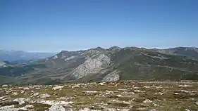![]() La sierra de Híjar, desde Valdecebollas, con la meseta de Peñalabra y las puntas del Tres Mares y del Cuchillón. Al fondo, los Picos de Europa y en segundo término, los escarpes calizos de la peña de las Agujas y la cueva del Cobre. | ||