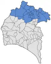 Está formada por los municipios de Alájar, Almonaster la Real, Aracena, Aroche, Arroyomolinos de León, Cala, Cañaveral de León, Castaño del Robledo, Corteconcepción, Cortegana, Cortelazor, Cumbres de Enmedio, Cumbres de San Bartolomé, Cumbres Mayores, Encinasola, Fuenteheridos, Galaroza, Higuera de la Sierra, Hinojales, Jabugo, La Nava, Linares de la Sierra, Los Marines, Puerto Moral, Rosal de la Frontera, Santa Ana la Real, Santa Olalla de Cala, Valdelarco y Zufre.