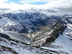 ![]() Sierra de Orpiñas en el centro, vista desde la divisoria Cantabria-León a 2446 m s. n. m. Abajo, a la izquierda, el valle de Lechada; a la derecha, el pueblo de Llánaves | ||