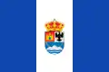 Paño rectangular vez y media más largo que ancho, terciado en vertical por tres franjas iguales azul, blanca y azul. En el centro de la enseña, el escudo municipal.[12]