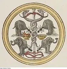 La serpiente de Serapis aparece en la antigüedad en numerosas ocasiones. Esta indicación añadida de una serpiente mordiéndose la cola, ya es descrita por Horapolo que menciona: