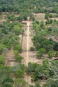 Sigiriya[3][4][5][6] consiste en un antiguo complejo construido por el rey Kasyapa durante el siglo V d. C. El sitio de Sigiriya contiene ruinas de un palacio situado en la parte superior de los roqueríos, una terraza de medio nivel que incluye la Puerta del León y el muro de espejo con sus frescos, el palacio inferior, que se interna bajo la roca, además de los fosos, muros y jardines que se extienden por cientos de metros desde la base de la roca.[2]