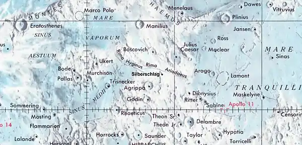 Justo al norte se halla la prominente Rima Ariadaeus, un amplio cañón rectilíneo que discurre en dirección este-sureste. Esta hendidura tiene unos 220 kilómetros de longitud, y continúa hasta la orilla del Mare Tranquillitatis al este.