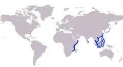 Se encuentra desde Sudáfrica hasta el Japón, incluyendo Singapur, Tailandia, China, Hong Kong , Taiwán y Filipinas.