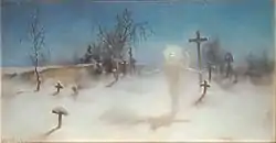Por último, cabe citar un artista ajeno al movimiento simbolista pero cuyo estilo tiene cierta vinculación con el mismo: Henri Rousseau, máximo representante del llamado arte naïf («ingenuo» en francés), un término aplicado a una serie de pintores autodidactas que desarrollaron un estilo espontáneo, ajeno a los principios técnicos y estéticos de la pintura tradicional, tachado en ocasiones de infantil o primitivo. Rousseau, aduanero de oficio, desarrolló una obra personal, de tono poético y gusto por lo exótico, en la que se pierde el interés por la perspectiva y se recurre a una iluminación de aspecto irreal, sin sombras ni fuentes de luz perceptibles, un tipo de imágenes que influyeron en artistas como Picasso o Kandinski y en movimientos como la pintura metafísica y el surrealismo.[83] La obra de Rousseau fue muy valorada por artistas simbolistas como Redon y Gauguin, especialmente por su colorido, del que señalaron que trascendía una «esencia mítica». Una de las obras de Rousseau más cercanas al simbolismo fue La guerra (1894, Museo de Orsay, París).[84]