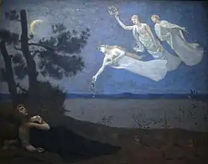 Otro referente avant-la-lettre fue Pierre Puvis de Chavannes, un pintor singular cuyo estilo difiere completamente del simbolismo barroco de Moreau, un estilo clásico y sereno que habría sido clasificado de academicista si no fuese por la elección de sus temas, donde sí se aprecia el recurso al símbolo y la alegoría como medio transmisor del mensaje.[49] Fue un destacado muralista, procedimiento que le venía bien para desarrollar su preferencia por los tonos fríos, que daban apariencia de pintura al fresco. Tenía un estilo más sereno y armonioso, con una temática alegórica de evocación de un pasado idealizado, formas simples, líneas rítmicas y un colorido subjetivo, ajeno al naturalismo.[58] En su juventud pasó brevemente por los talleres de Delacroix, Coutoure y Chassériau y realizó dos viajes a Italia, pero quizá lo más trascendente para la formación de su estilo sereno y reposado fue su relación con la princesa griega María Cantacuzeno, quien le transmitió su intensa espiritualidad.[59] En 1861, con las alegorías de La Guerra y La Paz (Museo Municipal de Amiens) inició su trabajo muralista, del que recibió numerosos encargos por toda Francia y que le haría famoso.[60] Realizó murales en los ayuntamientos de París y Poitiers, el Panthéon, la Sorbona y la Biblioteca Pública de Boston, entre otros. Su estilo monumental se basaba en la ausencia de profundidad, la linealidad constructiva y la majestuosidad compositiva, así como la reflexión filosófica inherente a sus escenas.[61] En 1890 fundó con Rodin, Carrière y Meissonnier la Société Nationale des Beaux Arts, que organizó diversas exposiciones de artistas jóvenes y nuevas tendencias hasta 1910.[62]