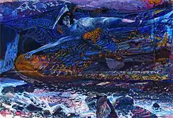 En la localidad bretona de Pont-Aven se reunieron entre 1888 y 1894 una serie de artistas liderados por Paul Gauguin,[85] que desarrollaron un estilo heredero del postimpresionismo con tendencia al primitivismo y gusto por lo exótico, con variadas influencias que van desde el arte medieval —especialmente tapices, vitrales y esmaltes— hasta el arte japonés. Desarrollaron una técnica denominada cloisonismo (por el esmalte cloisonné), caracterizada por el uso de zonas lisas de color delimitadas por contornos oscuros. Otro recurso estilístico introducido por esta escuela fue el llamado sintetismo, la búsqueda de la simplificación formal y del recurso a la memoria frente a la pintura copiada del natural. Este movimiento fue difundido por el crítico Albert Aurier y tuvo su punto culminante en la exposición titulada Pintores simbolistas y sintetistas organizada en el Café Volpini de París en 1889. Entre sus principales miembros, además de Gauguin, figuraron Émile Bernard, Louis Anquetin, Charles Filiger, Armand Seguin, Charles Laval, Émile Schuffenecker, Henry Moret, el neerlandés Meijer de Haan y el suizo Cuno Amiet.[86]