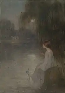 Alphonse Osbert estudió en la École nationale supérieure des beaux-arts de París, donde fue discípulo de Henri Lehmann, Léon Bonnat y Fernand Cormon. Su primer referente estilístico fue el Barroco español, especialmente José de Ribera.[66] También recibió la influencia de Georges Seurat y Pierre Puvis de Chavannes. A través de su amigo el crítico Henry Degron entró en el círculo de Maurice Denis y los Nabis, y asistió con asiduidad a los salones de los Rosacruz. La producción de Osbert se centró en un tipo de paisajes bucólicos y oníricos de tonalidades etéreas, con preferencia por el color azul y malva, poblado de figuras femeninas en actitud inmóvil, contemplativa.[67] La mayoría de ocasiones estas figuras aluden a las Musas, vestidas con velos vaporosos y enmarcadas en paisajes idílicos, generalmente de ambientación crepuscular.[66]
