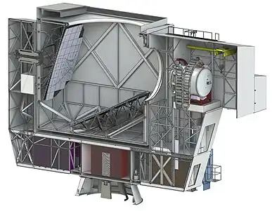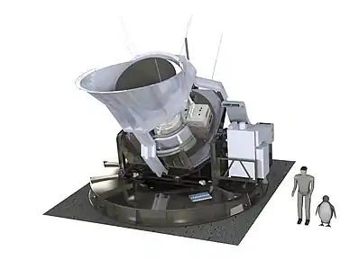 El telescopio de 6 metros de diámetro tiene un diseño Crossed Dragone. A una frecuencia de 90 GHz, tiene un campo de visión de más de 7,8 grados. Actualmente está en construcción por Antennentechnik en Alemania. Este telescopio tiene un diseño idéntico al del telescopio CCAT-prime de mayor frecuencia que también se encuentra en construcción.[7]