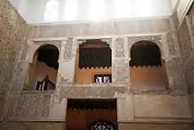 La sección de mujeres de la sinagoga está en la galería por encima del vestíbulo; sus medidas y disposición son idénticos a los del mismo. Aún se desconoce el motivo de por qué la galería de mujeres y el vestíbulo eran parte del edificio original. Variaciones en la estructura y la altura del techo sugieren que esta parte estructural fue añadida posteriormente. La sección de mujeres alberga tres amplios arcos que miran hacia el santuario, dichos arcos están decorados con estuco y celosía entrelazados, algo habitual en las sinagogas sefardíes. El material original de la celosía se desconoce, ya que no está realizada ni en estuco ni en madera. Los arcos están entrelazados con patrones elaborados y textos en hebreo. El arco central es distinto a los arcos exteriores, con una decoración desigual y teniendo más altura para facilitar la entrada.[13]