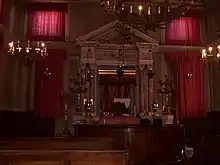 El interior también se rehízo en gran medida manteniendo la misma subdivisión de los espacios. Se trata de un gran salón cuadrado, con Ezrat Nashim sobre un balcón saliente en la entrada y paredes decoradas con estuco. La tevah es de madera con barandilla con balaustradas torneadas mientras que el Aròn ha-Kodeshes de mármol flanqueado por pares de columnas con capiteles corintios y tímpano triangular.