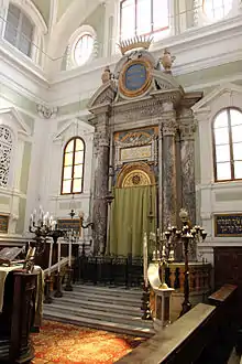 Particular es la silla de Elías, colocada en el lado izquierdo de la amplia entrada; fue donada a la Comunidad en 1860 por el rabino Nissim. En su respaldo de madera esta delicadamente tallado los versículos que recuerdan la circuncisión, ceremonia para la cual ha sido creada.