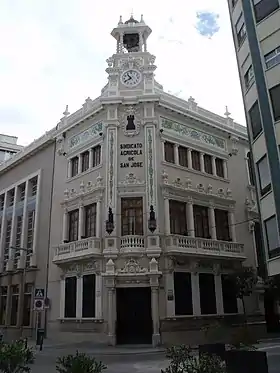 Respecto a la historia del edificio en sí del sindicato, su construcción se debe a la iniciativa de los socios que desde el año 1917 fueron avanzando pequeñas cantidades para la adquisición de los diferentes terrenos que se unificarían para la construcción del edificio que sería la sede del sindicato.[3] La unificación de los diferentes solares en uno solo se inició el 21 de febrero de 1927, cuando la Caja Rural adquirió cuatro inmuebles con fachadas a las calles de Alcora, Trinidad y Cervantes. A estos inmuebles se añade el antiguo hospital, sito en la calle Cervantes, con lo que se consigue una parcela de 490 metros (que al final había supuesto una inversión 65.210 pesetas -391,92 euros-) sobre los que se comienza la edificación de la sede el 1 de agosto de 1927. El arquitecto responsable del proyecto era Joaquín Dicenta y las obras (cuyo coste ascendió a 331.459,03 pesetas -1.992,11 euros-) finalizaron antes de mayo de 1929, ya que se llevó a cabo la bendición del edificio el 21 de mayo de 1929, de la mano del Obispo de la Diócesis de Tortosa, Félix Bilbao.[3][4] Desde el momento de su inauguración siempre han sido utilizadas estas instalaciones como oficinas de la Caja, aunque dos salones de la primera planta eran utilizados para el esparcimiento de los asociados (que durante la contienda civil fueron utilizados como cuarteles de las milicias locales y luego en hospitales militares en establecer el frente de combate cerca de Almassora. Tras la guerra, la sala de mayor tamaño se puso al servicio del bar-cafetería y en él se organizaban desfiles benéficos de modelos, exposiciones artísticas y conciertos musicales. Por su parte el otro salón, de menores dimensiones, y que era conocido como “Salón de Labradores”, se utilizó como despacho de don Joaquín Gallego hasta 1943, y para albergar todos los servicios de la "Mutua Agraria", que no tenía cabida en las oficinas generales de la planta baja. A partir de 1948, este salón vuelve a ser utilizado para esparcimiento de los socios, empleándose para bodas, primeras comuniones, despedidas de solteros, etc.). En la segunda planta se instaló la sala de lectura y biblioteca de la Cooperativa y Caja; aunque más tarde los locales fueron cedidos en un primer momento para Centro Juvenil de Acción Católica, y luego para la ubicación de la Biblioteca Municipal, del Ayuntamiento, que funcionó en este local entre 1952 hasta 1972. Esta segunda planta contaba con un salón de actos que fue utilizado, al mismo tiempo por la Congregación de San Luis para celebrar desde 1934 hasta 1948, sus reuniones literario-musicales y teatrales. Y más tarde la Caja Rural estableció y costeó entre 1949 y 1954 una Academia Nocturna de esta misma Congregación. Por otra parte, la planta baja restante fue proyectada inicialmente para almacén de abonos, pero jamás se utilizó para ello, sino que se empleó como una escuela nocturna para los hijos agricultores de los socios, sufragada íntegramente por la propia Caja. Durante la guerra civil los locales se utilizaron como iglesia improvisada. Y tras el conflicto bélico, se utilizó como economato cooperativo, en el que se distribuían comestibles. Cuando se consiguieron superar las penurias económicas de estos años, ya entrada la década de los 50, los locales empiezan a utilizarse para espacio deportivo en el que se realizaban competiciones deportivas de sala. En 1960, se inicia una gran reforma en la planta baja y los locales quedan destinados a sala de esparcimiento.[3] A lo largo de los años se fueron incorporando al edificio inicial inmuebles contiguos que iban desempeñando diferentes funciones según las necesidades de cada momento, expandiéndose el edificio inicial a lo largo de la calle Cervantes y la calle Trinidad.[3]