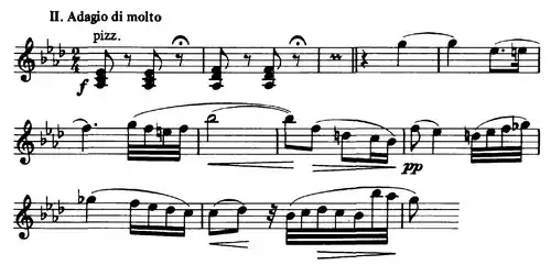 El segundo movimiento, Adagio di molto, está en la bemol mayor y en compás de 2/4. Tras una amplia apertura, el Adagio prosigue con abundantes y fluidas melodías que modulan libremente sobre una rica textura polifónica. Cabe destacar el uso que hace el compositor del oboe, empleado con frecuencia como solista aquí, así como en los movimientos primero y final.[2]