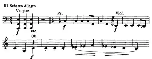 El tercer movimiento, Scherzo. Allegro, está en do mayor, en compás de 3/4 y sigue una forma sonata con desarrollo extendido. El contundente y precipitado Scherzo, con una sección en do mayor, re bemol mayor y sol mayor, devuelve el protagonismo a los timbales. La parte central está en mi mayor y se toca lento y sostenuto, hasta llegar a una transición de vuelta a la sección de canto en do mayor, donde el material anterior en re bemol mayor se repite en sol bemol mayor antes de una acelerada coda.[2]