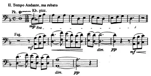 El segundo movimiento, Tempo andante, ma rubato, está en re menor y en compás de 4/4 que inmediatamente pasa a 3/8. A diferencia del movimiento inicial, en el que la dulzura de la introducción se recupera en la conclusión, el segundo movimiento está lleno de turbulencias y termina sin consuelo. Dos temas opuestos parecen enzarzarse en una batalla: Primero, una melodía fúnebre para fagot en re menor, marcada como "lúgubre", alcanza una culminación imponente en los vientos y los metales; después, un tema etéreo y rumiativo es interpretado por cuerdas divididas en la tonalidad de fa sostenido mayor.[1]