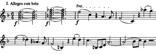El primer movimiento, Allegro con brio, está escrito en la tonalidad de fa mayor y en compás de 6/4. Se abre con un breve preludio de potentes acordes de viento, que introduce el primer tema, una melodía majestuosa, encomendada a los violines, acompañados de las violas y los violonchelos, con el apoyo de los trombones. El tema, particularmente brillante y de estilo casi heroico, se maneja con maestría a medida que avanza desde un flujo suave y pacífico hasta un cenit de vigor y majestuosidad. La transición al segundo tema, anunciada por los clarinetes, es un pasaje más tranquilo. El tema en sí, muy elegante y de estilo pastoral, le da al movimiento un carácter serio, reforzado aún más por la coda hábilmente construida.