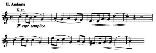 El segundo movimiento, Andante, está en do mayor y en compás de 4/4. Casi podría llamarse rapsodia, ya que no está elaborado como de costumbre. De hecho, el movimiento se basa y desarrolla en gran medida en torno al tema inicial, que es una melodía sencilla pero muy grácil y alegre, que infunde serenidad interior y alegría, en fuerte contraste con el carácter épico de esta obra. Este tema es retomado de vez en cuando por los vientos, las violas, los violonchelos, tratados con variaciones libres que le dan un timbre agradable. El primer tema queda momentáneamente aparcado, cuando clarinetes y fagotes se enfrascan en un fraseo nervioso, que parece presagiar lo que vendrá a continuación. Pero la brevedad del episodio no permite hablar de un verdadero segundo tema. El tema inicial regresa repentinamente y se mantiene, con efectos deliciosamente contrastados, hasta la conclusión.