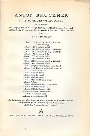 Con el Anschluss de Austria a la Alemania de Hitler en 1938, la Musikwissenschaftlicher Verlag Wien (MWV) y la Internationale Bruckner-Gesellschaft (IBG) de Viena se disolvieron y todos los esfuerzos se transfirieron a Leipzig. En 1945, al final de un bombardeo aéreo a Leipzig, el fondo editorial fue destruido. Después de la guerra, la producción documentada del IBG, el MWV y Bruckner regresó a Austria. En 1951, Leopold Nowak presentó el primer volumen de la Neue Bruckner-Gesamtausgabe con una reimpresión corregida de la edición de la Novena Sinfonía de Alfred Orel. Nowak ya había trabajado en funciones de edición de partituras antes de 1945, había trabajado en el descubrimiento de nuevas fuentes y había corregido errores.[13]